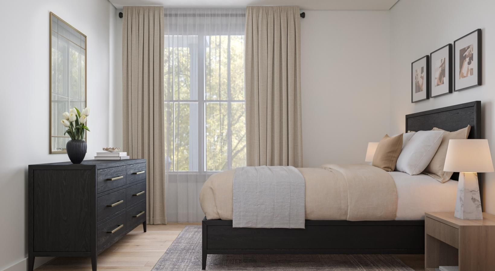 • a bedroom with a bed and a dresser