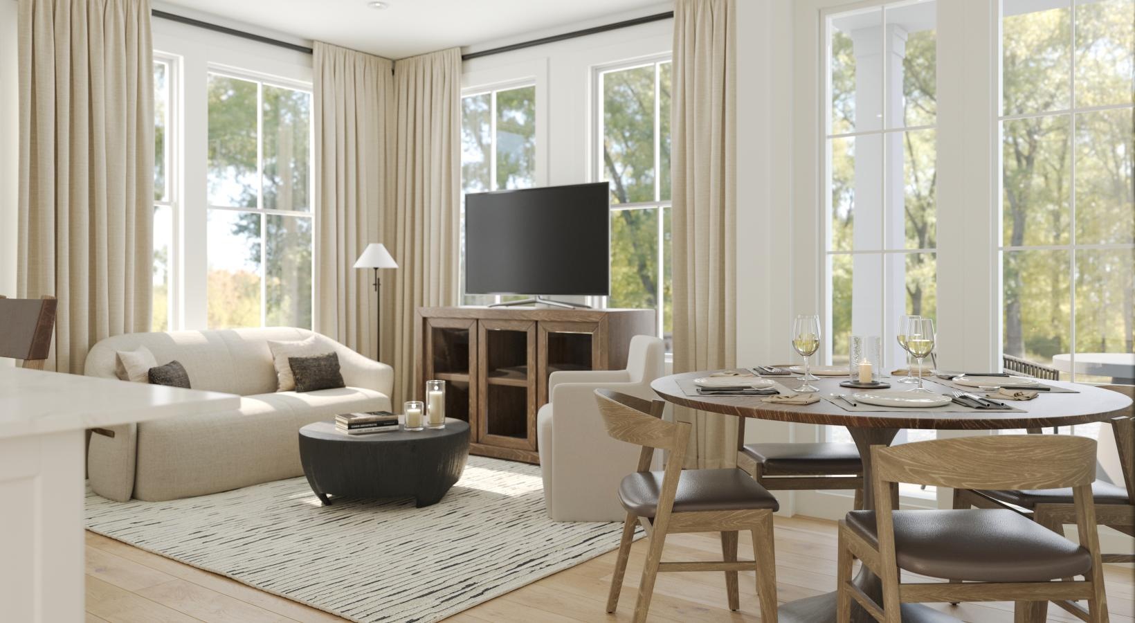• a living room with a dining table and couches