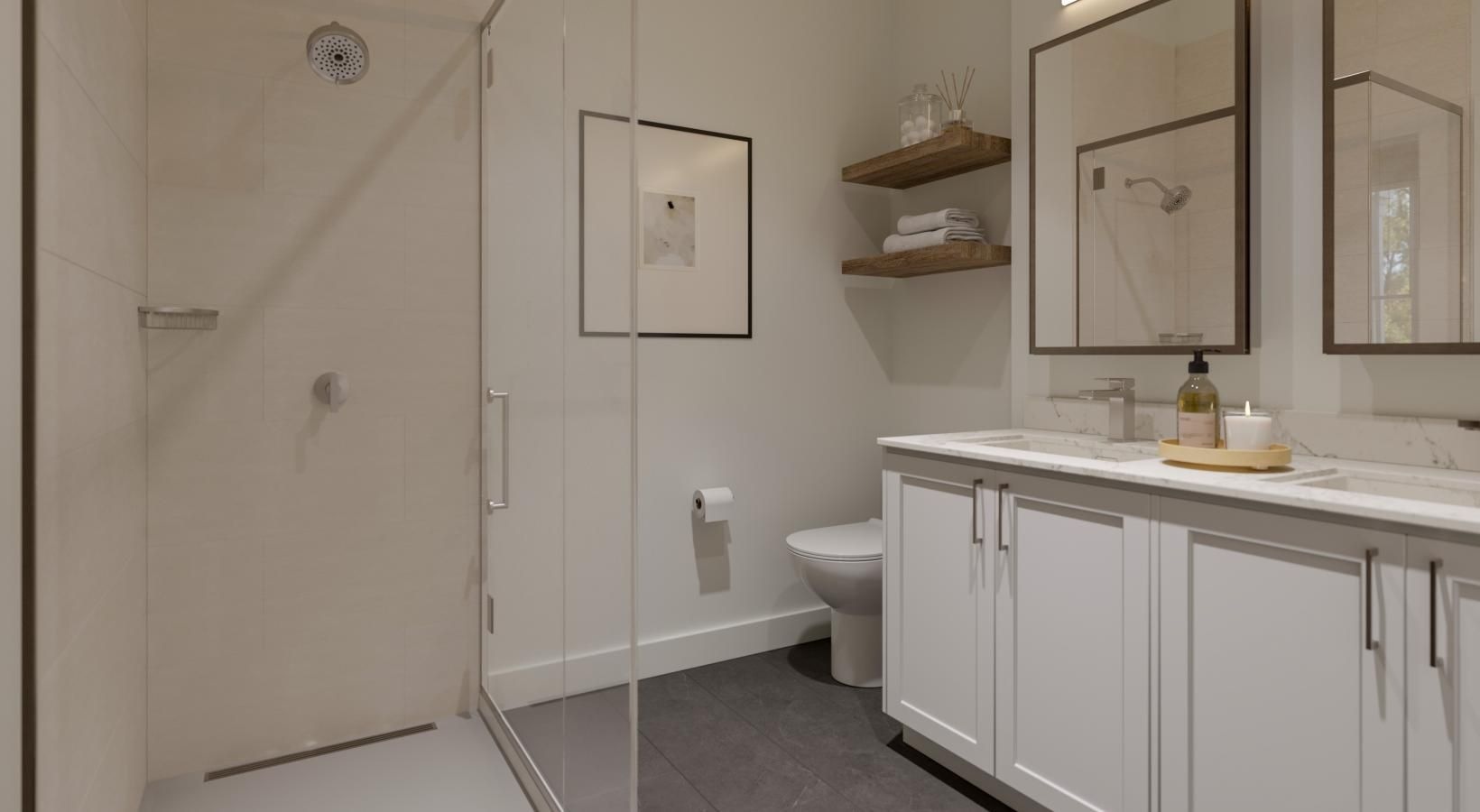 • a bathroom with a glass shower, toilet and sink